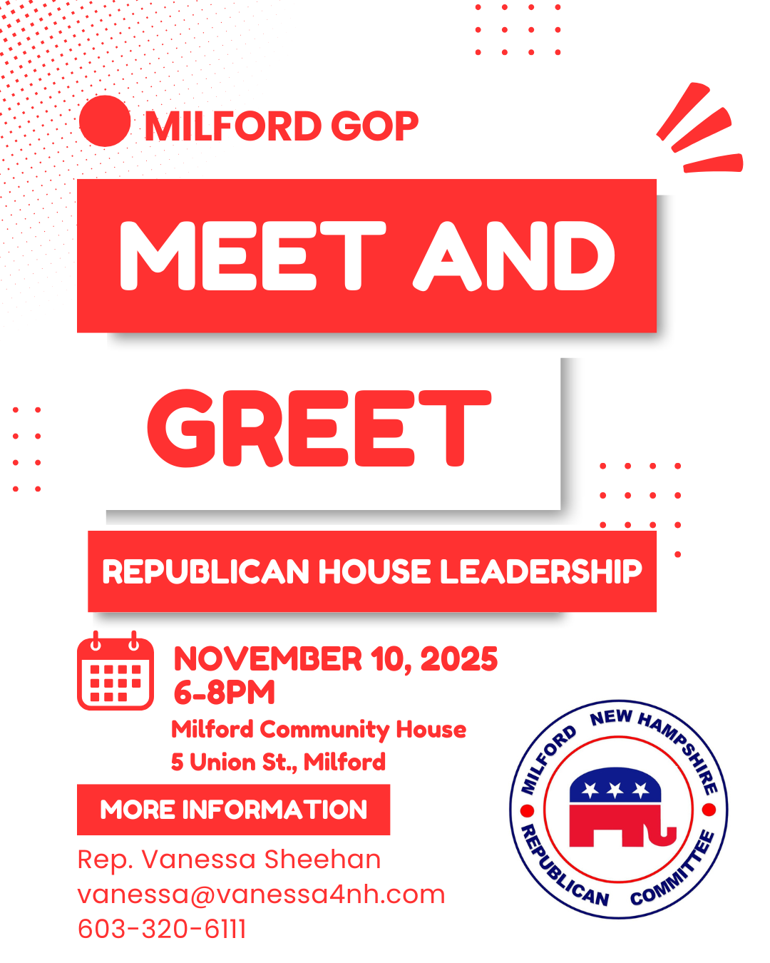 In lieu of a November meeting we will have a Meet and Greet on November 10, 2025 from 6:00 PM – 8:00 PM at the Milford Community House, 5 Union St, Milford, NH with House Republican Leadership.